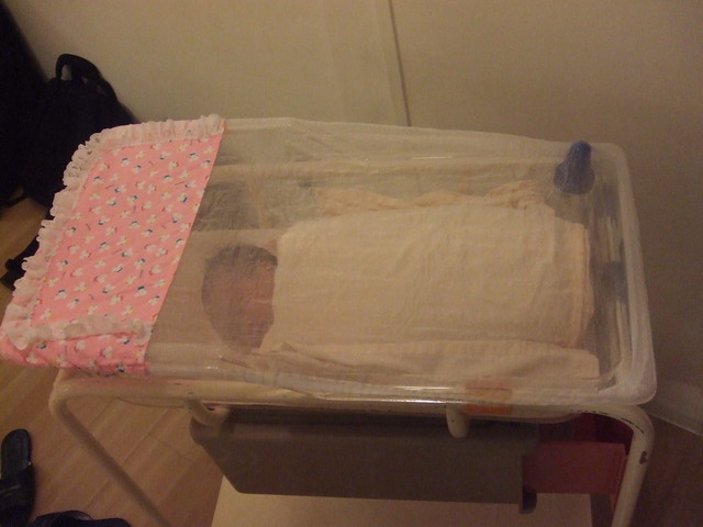 好不容易朋友走了,又開始張羅餵母奶,這小傢伙大概是配方奶喝慣了,媽媽的量不足的情況下不愛喝。好不容易弄定,老婆便去自我護理了,放在小床上睡覺的小雙雙突然哭了起來,弄得我這個新手爸爸突然間慌張失措了起來,有鑑於剛剛吃飽,心想小雙雙應該是便便或尿尿了吧,強自鎮定的我手忙腳亂的就幫小朋友拆包巾,擦屁屁,換尿片,在給他醜醜的包起來。哈,包的還真醜。